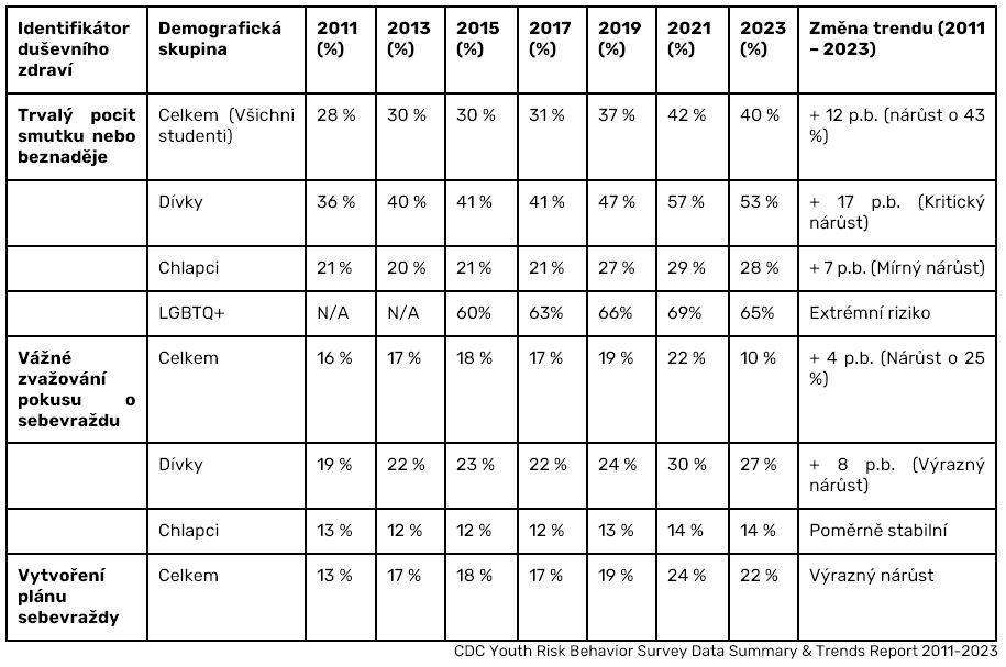 Centrum pro kontrolu a prevenci nemocí (CDC) ve Spojených státech zpracovalo jednu z nejdetailnějších analýz. Poskytuje obsáhlý datový soubor vycházející z dlouhodobého monitoringu Youth Risk Behavior Survey (YRBS). Sledování začíná rokem 2011 jako posledním relativně stabilním rokem před začátkem výraznějšího nárůstu duševních problémů. Jako hlavní identifikátor prezentuje procento studentů pociťujících trvalý smutek nebo beznaděj po dobu dvou a více týdnů, což je klinická hranice depresivní poruchy.4