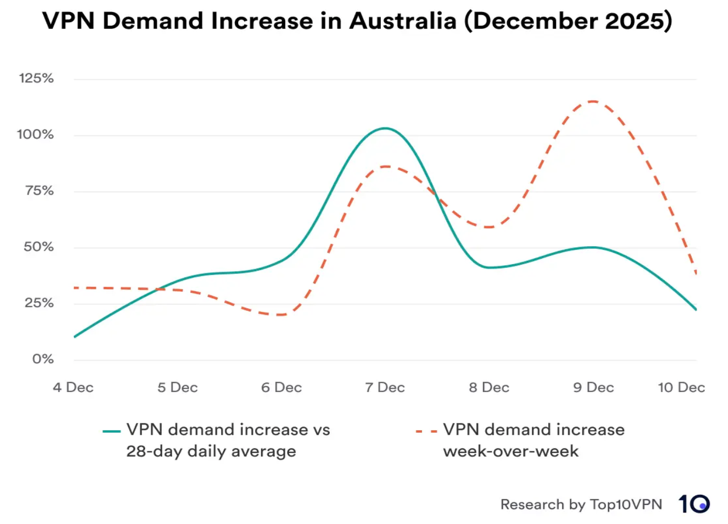 Data ukazují jasnou korelaci mezi implementací nového zákona a poptávkou po těchto nástrojích. Během týdne před účinností zákazu byla poptávka po VPN o 51 % vyšší než v týdnu předchozím. 7. prosince, poslední víkend před zavedením, vzrostla poptávka po VPN až na 103 % ve srovnání s denním průměrem za předchozích 28 dnů. Čtyři aplikace z pěti nejstahovanějších bezplatných aplikací v Austrálii byly právě VPN.22