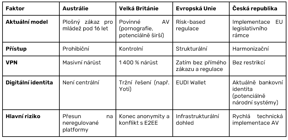 Specificky se věnuje Austrálii, která v prosinci 2025 zavedla dosud nejpřísnější zákaz sociálních sítí na světě, a Velké Británii, kde po implementaci Online Safety Actu na počátku roku 2026 došlo k razantním změnám v dostupnosti obsahu pro dospělé a k navazující eskalaci využívání VPN.